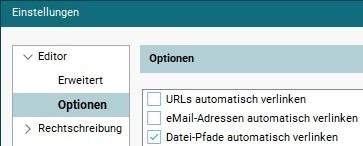 Das ist generell sehr praktisch, wird aber nicht immer gewünscht. Aus diesem Grund lässt sich diese Funktion in den Einstellungen des TeamDavid Client deaktivieren. Hierzu stehen dort unter dem Punkt »Editor/Optionen« drei Schalter zur Verfügung, mit denen die automatische Verlinkung für jeden Typ (URLs, eMail-Adressen und Datei-Pfade) separat ein- oder ausgeschaltet werden kann.