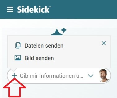 Auch mit Sidekick besteht die Möglichkeit, Bilder und Dateien von der KI analysieren zu lassen. Voraussetzung dafür ist natürlich, dass der gewählte Intelligent Agent, bzw. das betreffende KI-Modell tatsächlich über diese Fähigkeit verfügt. Ist das der Fall (z.B. bei Gemini 2.0 oder GPT-4o ), stehen nach einem Klick auf das Plus-Zeichen im Prompt-Eingabefeld die Funktionen zum Hochladen von Bildern und Dateien zur Verfügung.
