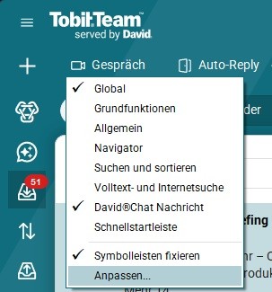 Die Symbolleisten in Tobit.Team bieten die Möglichkeit, bevorzugte oder häufig verwendete Funktionen direkt als Schaltfläche zur Verfügung zu stellen. Damit lässt sich der Arbeitsfluss spürbar beschleunigen und vereinfachen. Welche Symbolleisten angezeigt und welche Funktionen darüber bereitgestellt werden sollen ist ganz individuell konfigurierbar.