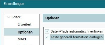 Wer lieber mit der Tastatur arbeitet, findet dafür ab sofort eine eigene Option in den Editor-Einstellungen des TeamDavid Client (siehe »Einstellungen / Editor / Optionen«). Ist hier der Punkt »Texte generell formatiert einfügen« aktiviert, werden beim Einfügen von Text über die oben genannten Tastatur-Shortcuts vorhandene Formatierungen übernommen. Ansonsten erfolgt das Einfügen als reiner Text.
